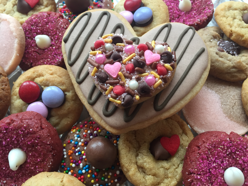 It's a great change from the same old candy & cake! Each Flavor Wrapped. These cookie gifts are dramatically elegant and unusually delicious flavors. Always a crowd pleasser as they disappear quickly. Your Homemade Cookie Sampler Assortment Flavors Are (From the Top) Lux Sprinkle Heart Favor, Red Velvet, M & M, Malted Milk, Peanut Butter Kiss, NY Pink Vanilla & Chocolate and Famous Chocolate Chip (Occasional Substitutions)